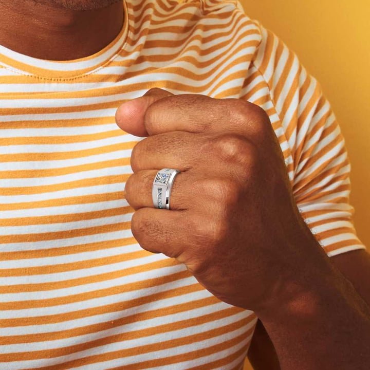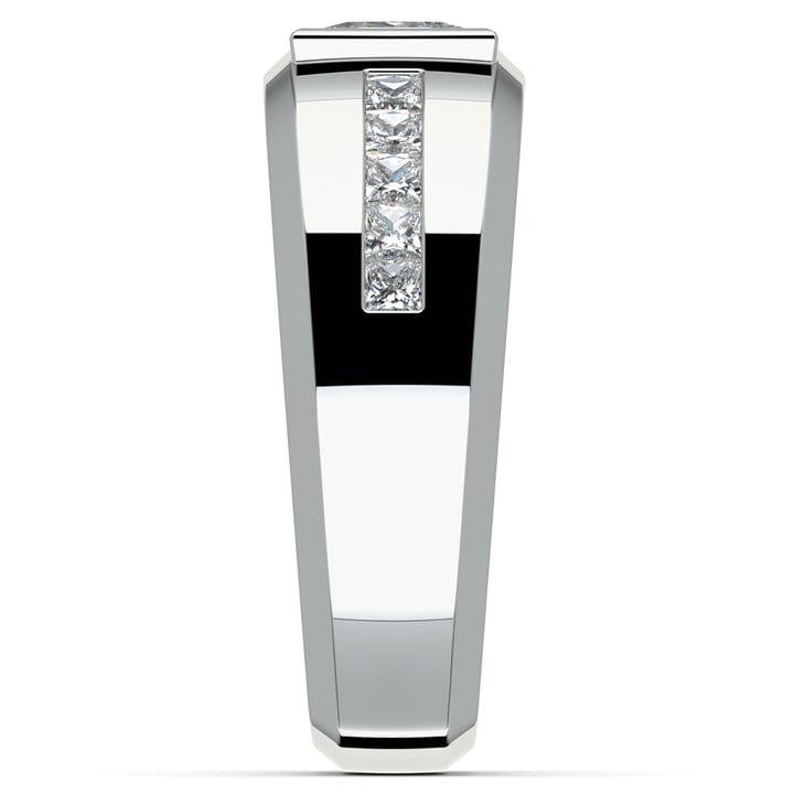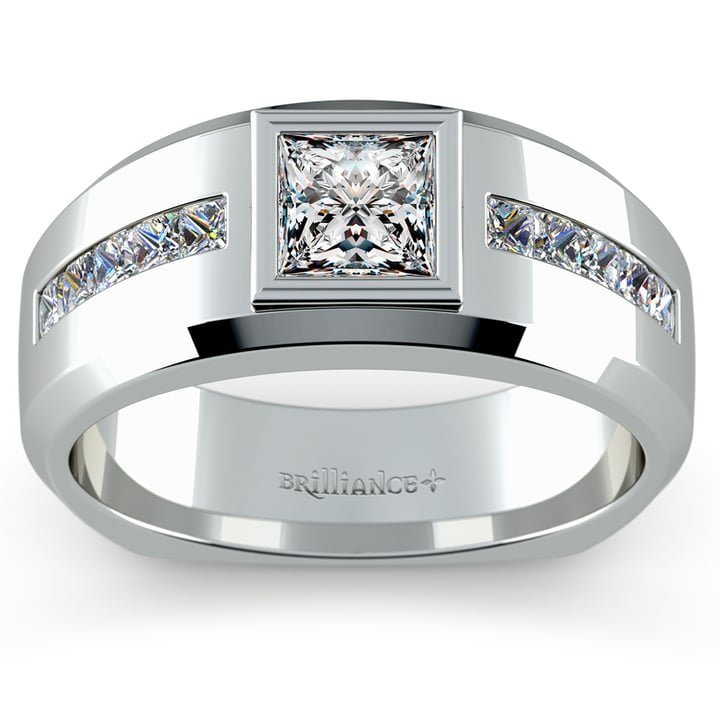 This eye-catching mens diamond ring was inspired by hunters being guided by the night’s stars. Orion guides the eye to the 3/4 carat princess center stone with a line of ten channel set princess diamonds for a total weight of 1 1/6 carat. Beveled edges and a tapered shank add elegance. Available in platinum or white gold. Mangagement™ by DSH Jewels.