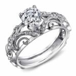 Diamond studded scroll-work with delicate milgrain etching accent this white gold engagement ring from Parade’s Hera Bridal collection. Style R3072 features twenty-two round diamonds for approximately 1/8 total diamond weight to accent your choice of center stone (not included).