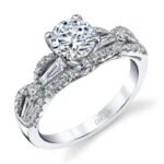 Radiating beauty and inspired by a vintage style, this delicate engagement ring in white gold is adorned with baguette diamonds beside scalloped waves of diamonds leading to a gorgeous center stone (not included). Style R3517 from Parade’s Designer Hemera Bridal Collection will truly shine brilliantly and capture the eyes of all with its magnificent Lyria Signature Crown 18K white gold setting.