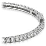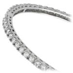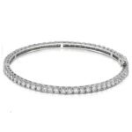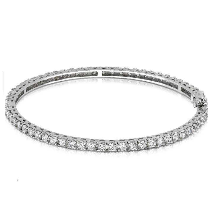 Sixty three round cut diamonds are prong set in this elegant diamond eternity bangle in 14k white gold. Approximately 5 1/2 carat total diamond weight and proudly made in the USA.