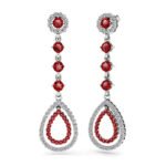 These classic Diamond and ruby teardrop earrings in 14k white gold feature 48 Diamonds and 16 ruby gemstones, for a total of 128 Diamonds and gemstones. Approximately 2 1/3 carat total weight and proudly made in the USA.