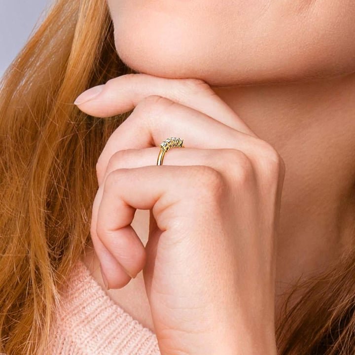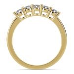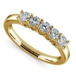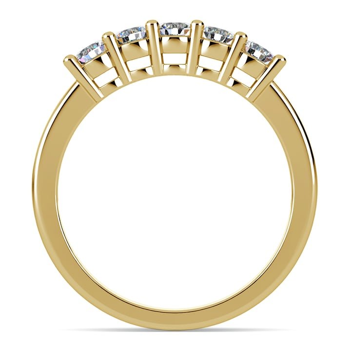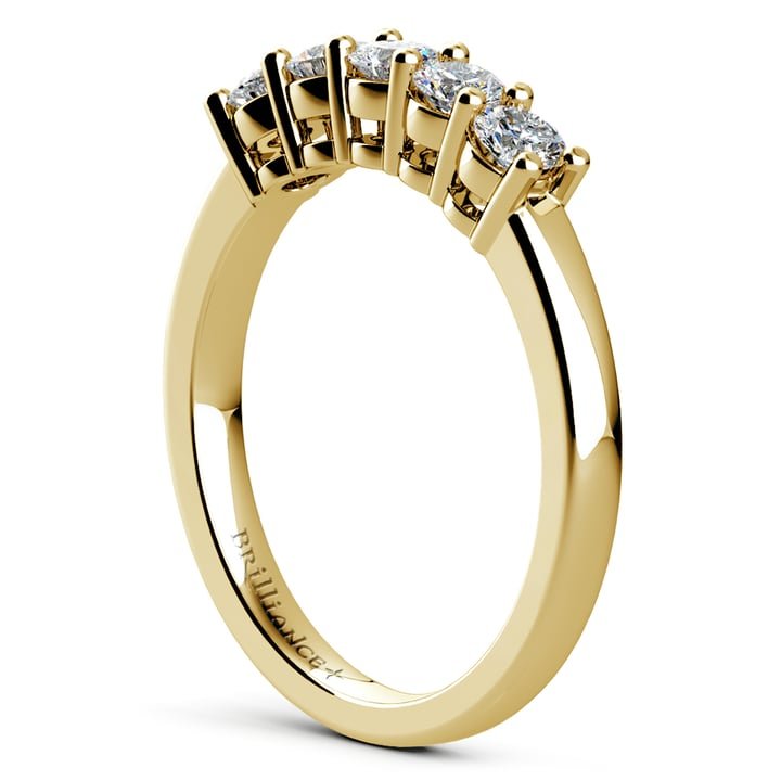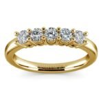 A beautifully classic five stone diamond wedding band in 14k or 18k yellow gold. A shared prong, open gallery setting on the ring allows each of the five round cut diamonds to shine brilliantly. Approximately 1/2 carat total diamond weight and proudly made in the USA.