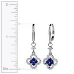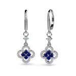 These four-leaf Diamond and sapphire clover earrings are a classic design with a unique sapphire gemstone touch. Thoughtfully crafted from 14k white gold, they feature 47 round cut Diamonds with a 0.07pt round cut Diamond suspended in the center and 4 sapphire gemstones in each dangle earring. Approximately 1 1/3 carat total Diamond weight.