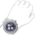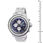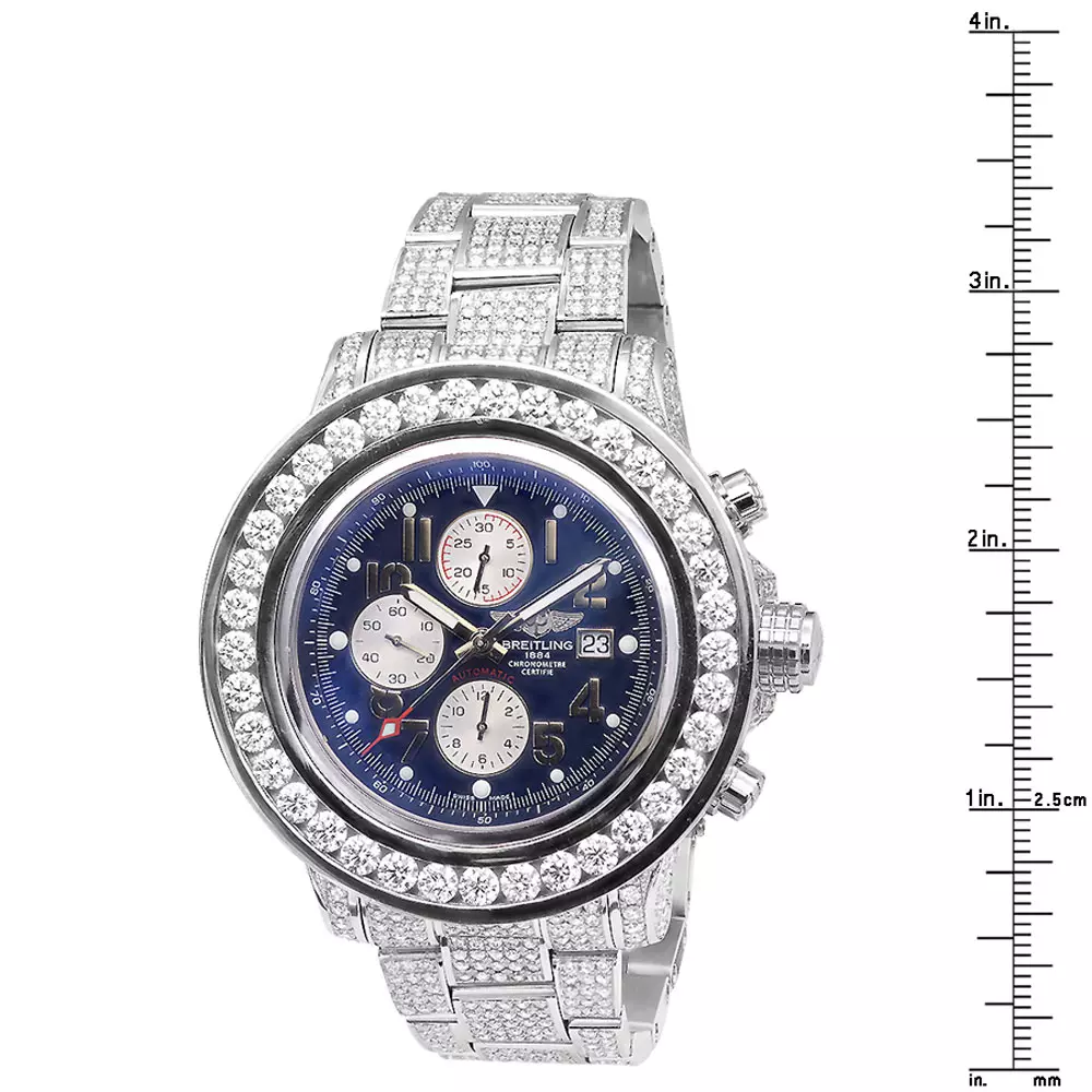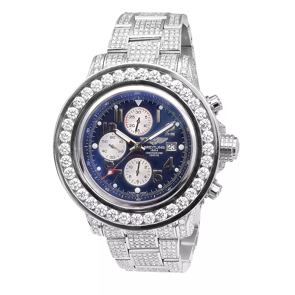 Introducing the Breitling Super Avenger diamond watch for men 23.78ct. This luxurious watch is crafted from stainless steel and features a 52mm case diameter with a silver color. The bezel is adorned with diamonds in a white color, while the bracelet is made of stainless steel and is also adorned with diamonds in a white color. The dial is a stunning blue color and is protected by a scratch-resistant sapphire-coated window. This Breitling diamond watch showcases a navy blue dial with three chronograph subdials and a date display window at the 3 o’clock position. The hands and markers are silver-tone and the movement is automatic.This men’s diamond Breitling Super Avenger watch is a luxurious and stylish watch that is perfect for any occasion. It features a chronograph, date indicator, and second hand-indicator, making it a great choice for those who need to keep track of time. The watch is also water resistant up to 300 meters, making it perfect for swimming and other water activities. With its iced-out design, large size, and luxurious features, this watch is sure to turn heads. Whether you?re looking for a watch for everyday wear or a special occasion, the Breitling Super Avenger is a perfect choice.