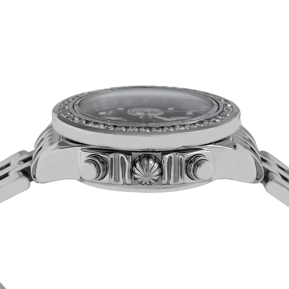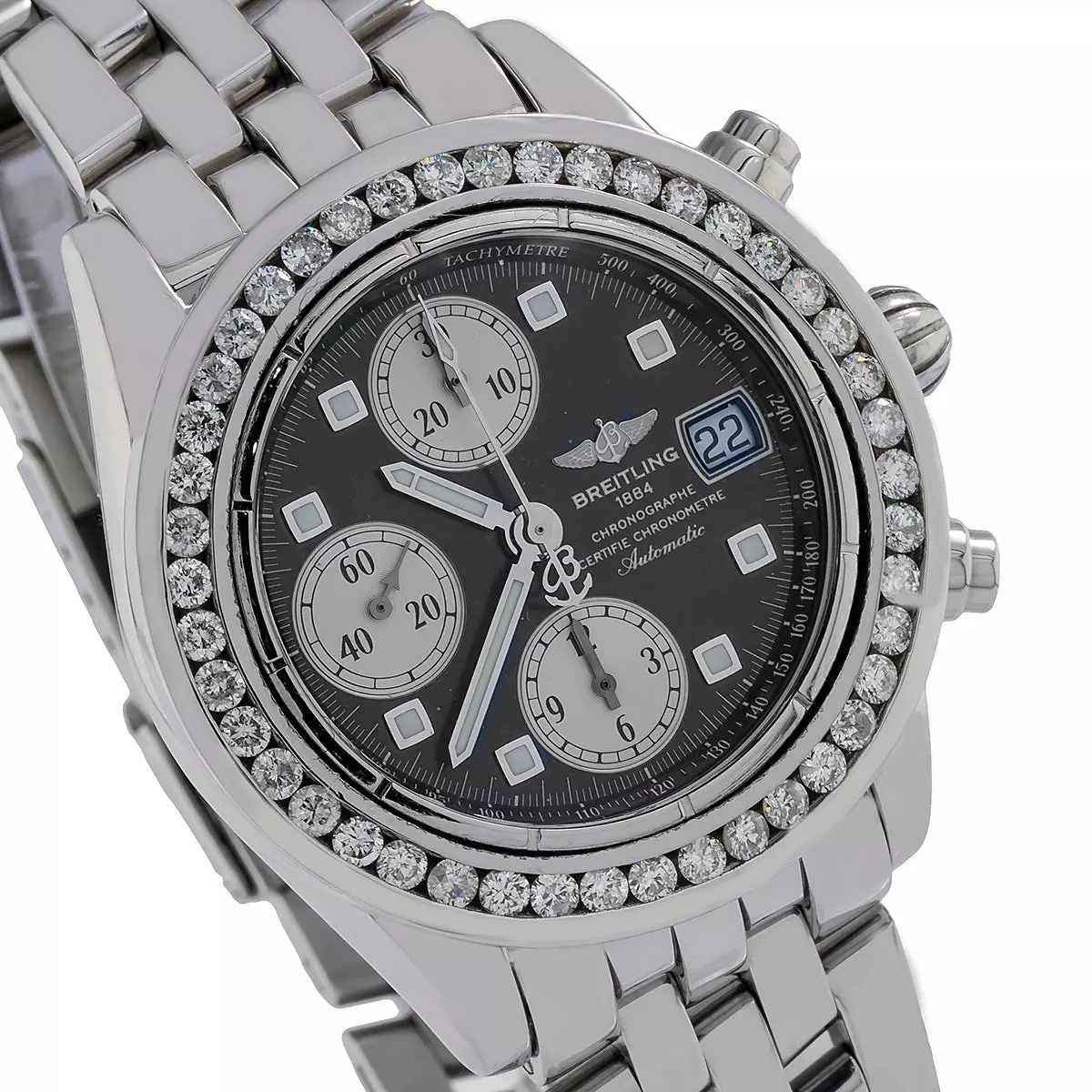 Introducing the Breitling Chronomat 39 mm Black Dial Men’s Diamond Watch. This luxurious timepiece is crafted from stainless steel and features a bezel set with 2 carats of white diamonds. The black dial is adorned with luminous hands and markers, and the sapphire crystal ensures a clear view of the time. The watch is powered by an automatic movement and is water-resistant up to 100 meters. The stainless steel bracelet is comfortable and secure, and the watch is engravable for a personal touch. Whether you’re looking for a special gift or a timeless accessory for yourself, the Breitling Chronomat 39 mm Black Dial Men’s Diamond Watch is sure to make a statement. With its classic design and luxurious details, this watch is sure to become a treasured heirloom. This diamond watch is pre-owned, in excellent condition, and comes in an original box with a full warranty from DSHjewels.com.