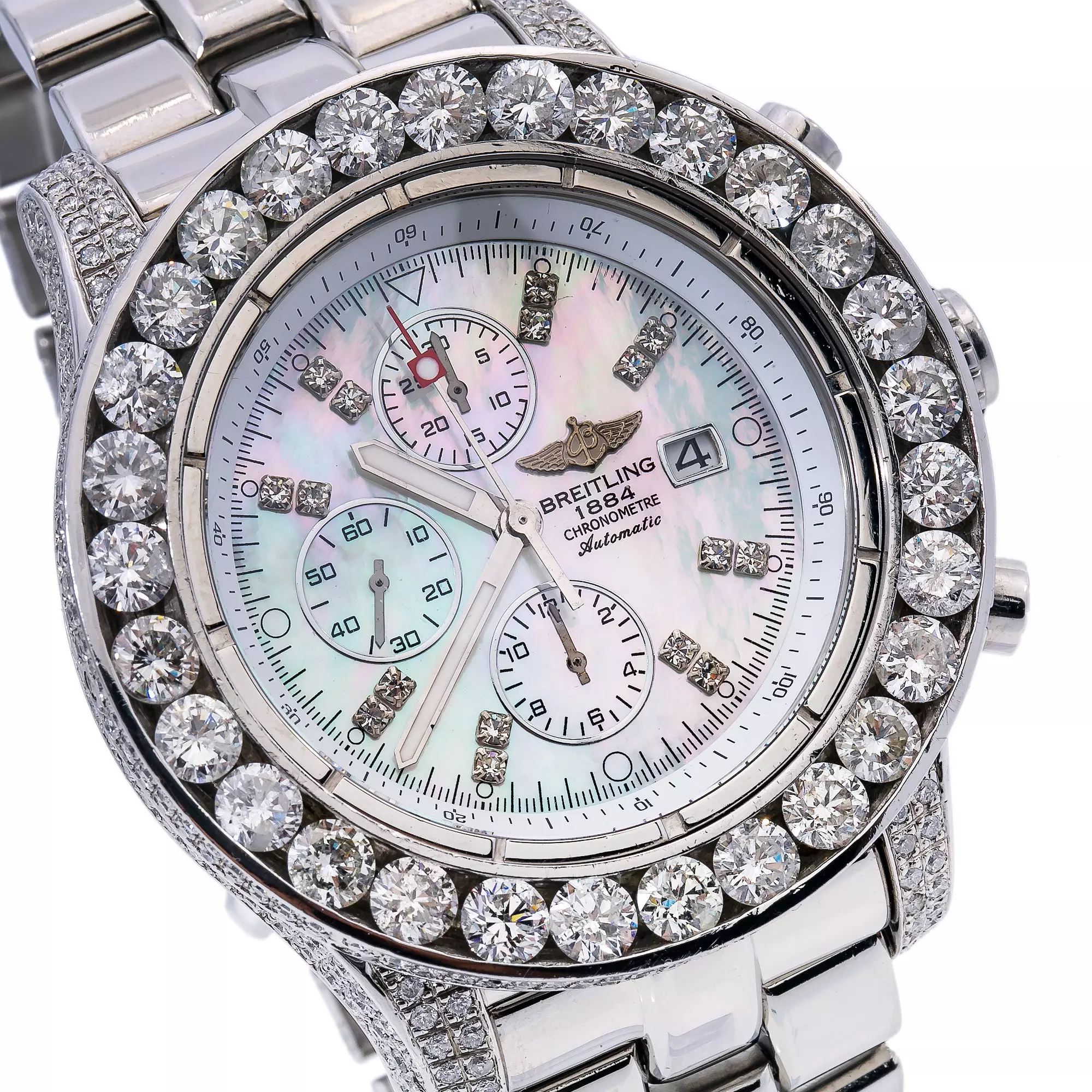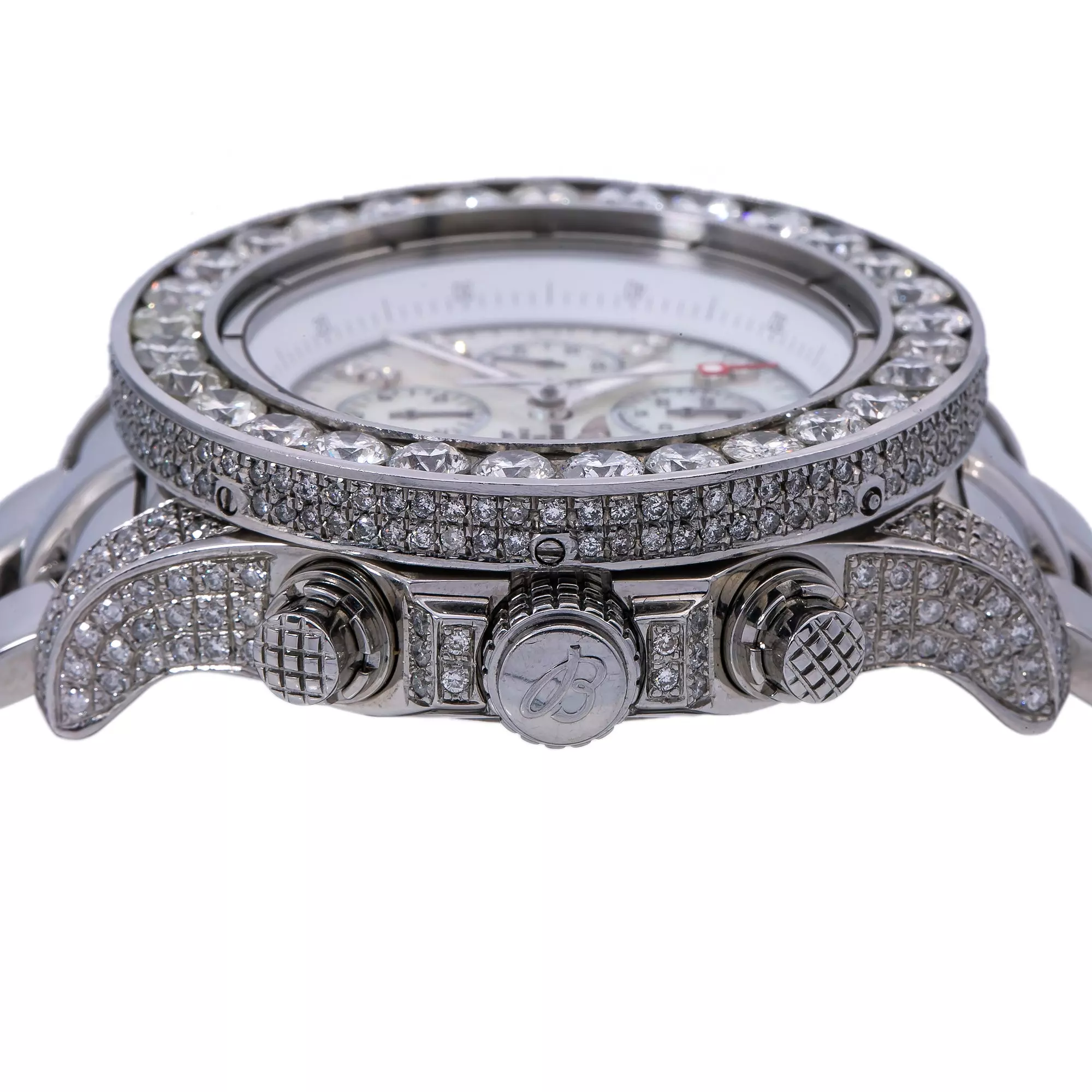 Introducing the Breitling Super Avenger 42 mm Men’s Diamond Watch. This luxurious timepiece is crafted with a stainless steel bezel that is adorned with 16.5 carats of white diamonds. The dial is made of mother of pearl and features a sapphire crystal for added durability. The stainless steel bracelet is comfortable and stylish, making this watch perfect for any occasion.The Super Avenger is powered by an automatic movement and is water resistant up to 100 meters. This watch is also engravable, making it a great gift for a special someone. The Breitling Super Avenger is a timeless piece that will last for years to come.This watch is perfect for the man who appreciates quality and style. With its luxurious design and superior craftsmanship, the Breitling Super Avenger is sure to make a statement. Whether you’re looking for a timeless timepiece or a special gift, the Breitling Super Avenger is the perfect choice. This diamond watch is pre-owned, in excellent condition, and comes in an original box with a full warranty from DSHjewels.com.
