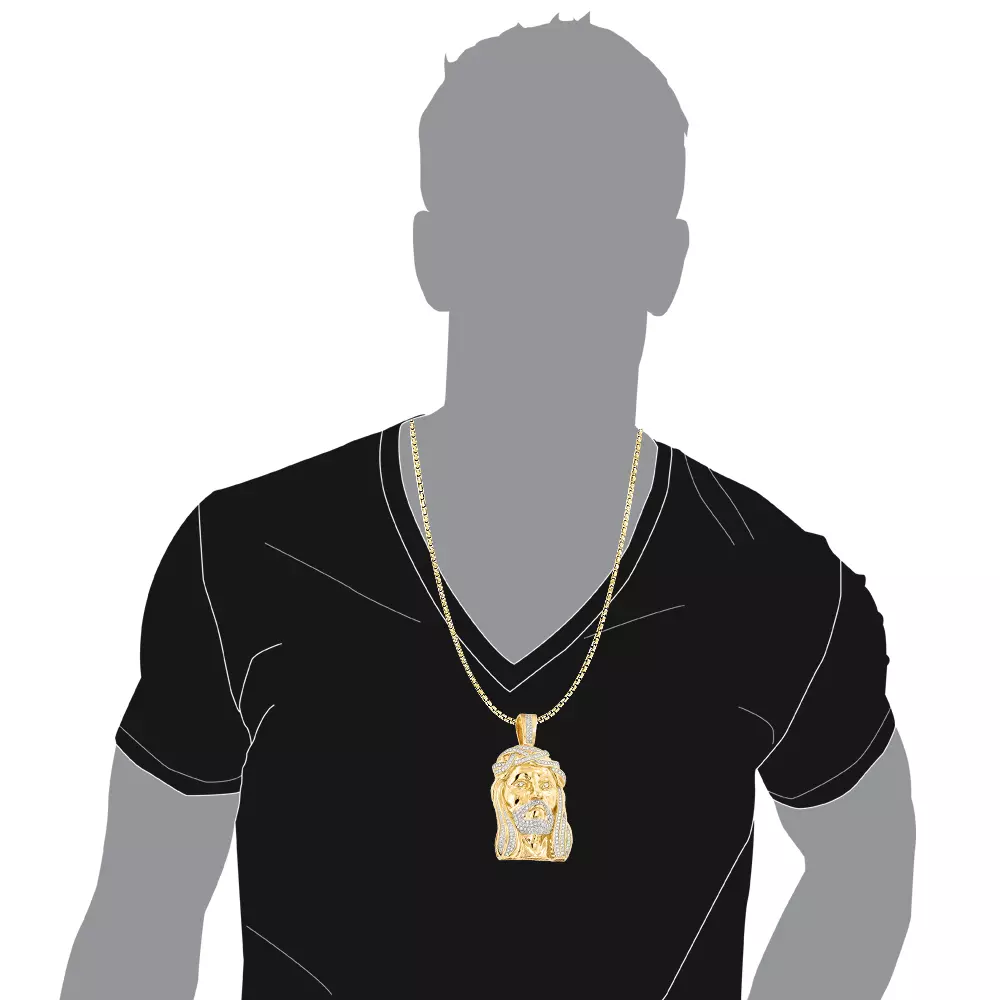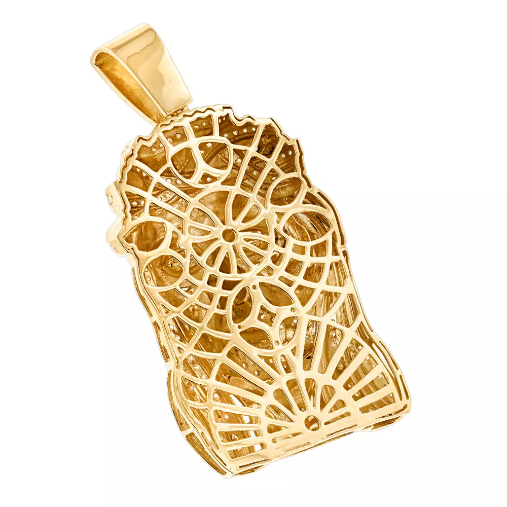 Real Hip Hop Jewelry! This large 14k Gold Diamond Jesus Face Pendant is over 3 inches long (with bail) features amazing 7 carats of dazzling round diamonds. Showcasing a classic design and a highly polished gold finish, this men’s diamond Jesus head pendant is available in 14K white, yellow and rose gold, and can be custom made with different color diamonds. You also can personalize this piece or check custom pendants we’ve already made and create your own design.