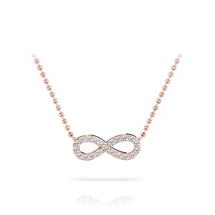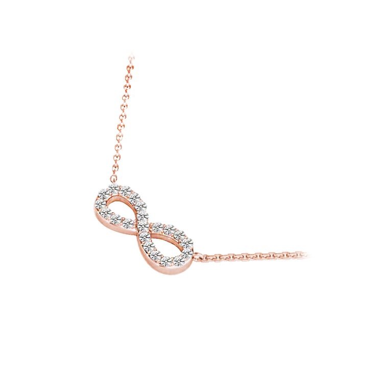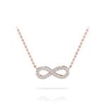 Symbolize never-ending love with this delicate charmed rose gold Diamond infinity necklace. Twenty-two round Diamonds form an infinity symbol in rose gold. Suspended by a cable-link chain in rose gold and proudly made in the USA.