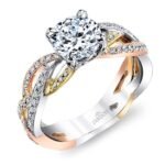 A show-stopping tri-color gold engagement ring, three polished strands of white, rose and yellow gold intertwine on this extravagant engagement ring leading to a brilliant center stone of your choice. Style R2894 Is part of the Hemera Bridal Collection by Parade Design.