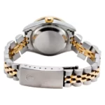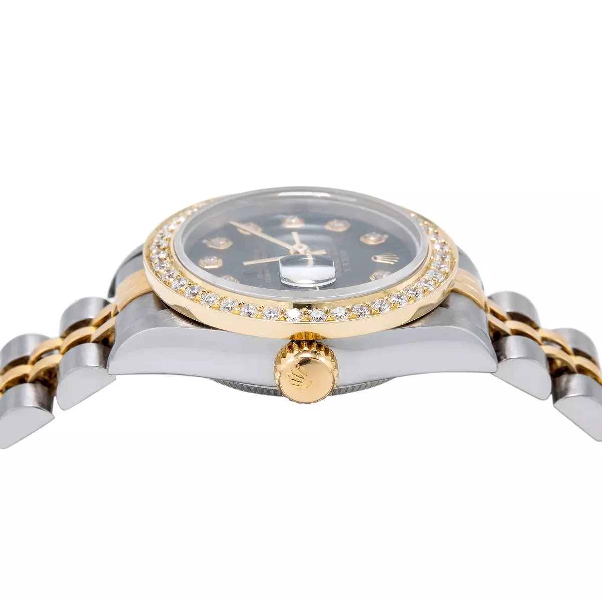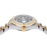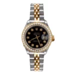 This Two Tone Ladies Rolex Datejust 69713 26mm 0.90ct Diamond Watch With Black Dial And Diamond Bezel merges power and femininity. This beautiful timepiece is featuring a shiny 26mm stainless steel case, stainless steel Jubilee bracelet with 18k gold and an 18k gold bezel incrusted with white round diamonds creating a dazzling circle around it’s stylish black dial. The dial is showcasing sparkling diamond hour markers and a date display at 3 o’clock position. This ladies diamond Rolex watch features 0.9 carats of genuine diamonds and offers unrivalled elegance. Please note: this ladies Rolex watch is pre-owned, in excellent condition and comes in an original box with a full 5 year warranty from DSHjewels.com. These pre-owned Rolex watches are authentic Rolex watches with genuine diamonds, in excellent condition, they are checked for authenticity and basic water resistance; watches will withstand an occasional rain just fine, but they are not diver’s watches and should not be worn in shower or while swimming.