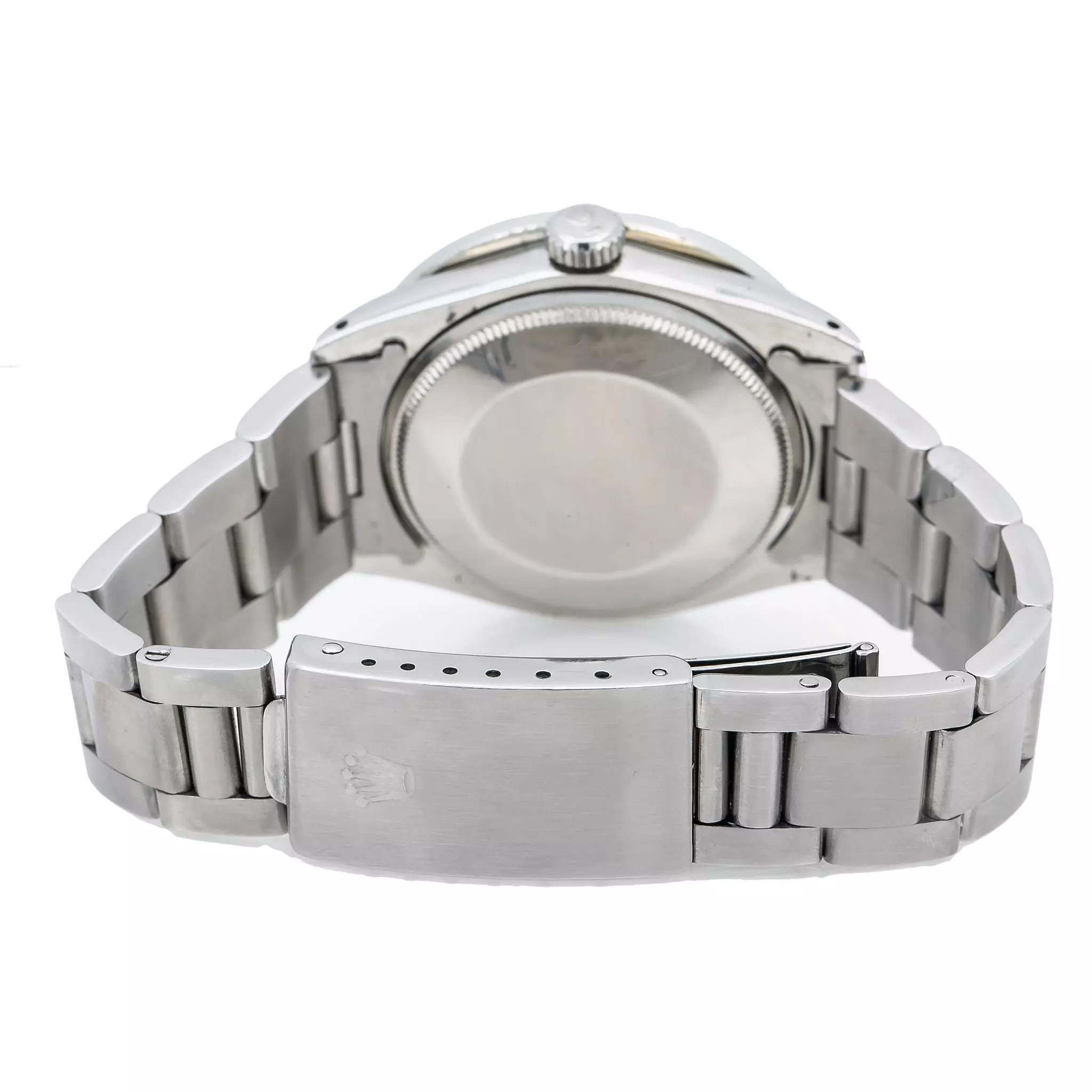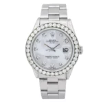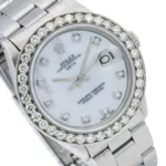 The Rolex Oyster Perpetual Datejust 34mm W00943 is a stunning timepiece for the modern woman. This watch features a stainless steel case and bracelet with a diamond bezel and white bezel stones. The dial is a silver tone with diamond accents and a sapphire crystal for extra protection. The movement is automatic and the watch is engravable, making it a perfect gift for a special occasion.The Oyster Perpetual Datejust is a classic Rolex design that has been around for decades. It features a 34mm case diameter and a width of 34mm. The stainless steel bracelet is an Oyster type and is comfortable to wear. The bezel is set with diamonds and white bezel stones for a luxurious look.The Oyster Perpetual Datejust is a timeless piece of jewelry that will never go out of style. It is perfect for any occasion and will look great with any outfit. The watch comes with a 5-year warranty. It is a great investment for any woman who wants to add a touch of luxury to her wardrobe. This watch has durable highly polished stainless steel. This diamond watch is pre-owned, in excellent condition, and comes in an original box with a full warranty from DSHjewels.com.