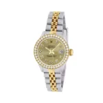 The Rolex Oyster Perpetual Datejust is the perfect watch for the modern woman. This beautiful timepiece is crafted from a combination of yellow gold and stainless steel, with a 26mm case diameter and a champagne dial. The bezel is set with diamonds and is made from yellow gold, while the bracelet is made from yellow gold and stainless steel. The dial is adorned with diamonds, and the crystal is a sapphire crystal. The movement is automatic, and the watch is engravable.This watch is perfect for any occasion, whether you?re attending a formal event or just running errands. The yellow gold and stainless steel combination gives the watch a classic look that will never go out of style. The diamonds on the bezel and dial add a touch of sparkle and glamour, making this watch a timeless piece. The sapphire crystal ensures that the watch is scratch-resistant and will last for years to come.The Rolex Oyster Perpetual Datejust is a luxurious timepiece that will make a statement wherever you go. It is a classic and timeless piece that will never go out of style. This watch comes with a 5-year seller?s warranty, so you can be sure that your investment is protected. This diamond watch is pre-owned, in excellent condition, and comes in an original box with a full warranty from DSHjewels.com.