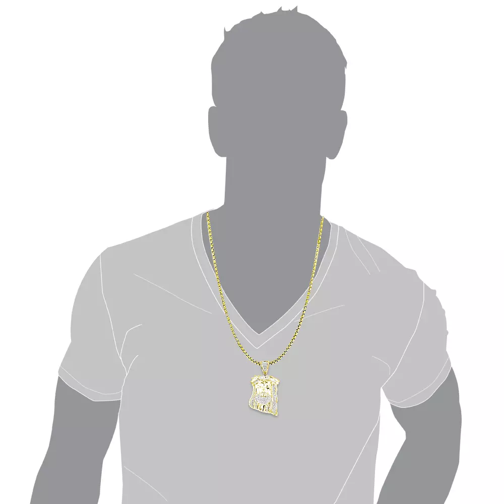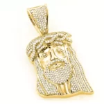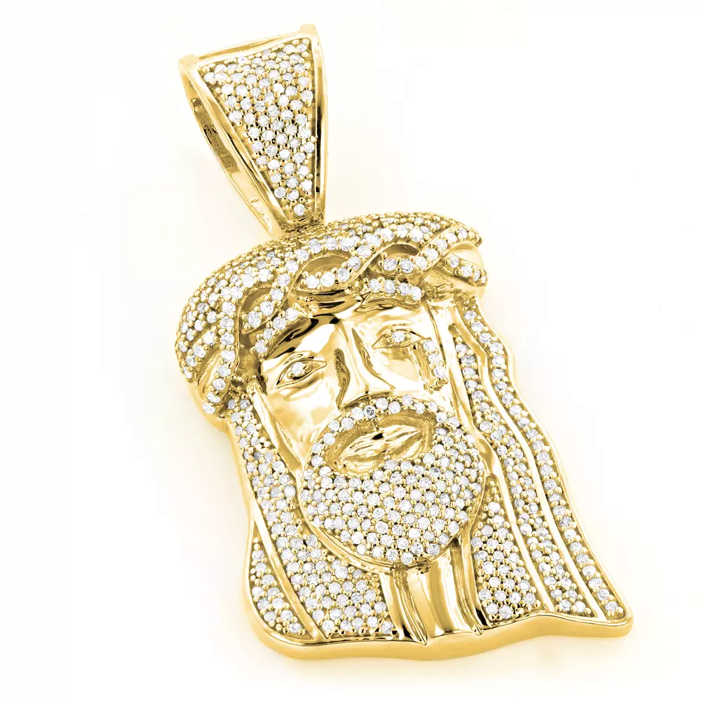 This Yellow Gold Plated Diamond Jesus Head Pendant in Sterling Silver features 1.04 carats of sparkling round diamonds. Showcasing a classic design and a luxurious yellow gold plating for extra shine, this men’s diamond Jesus pendant is also available with a white gold plating or in solid gold, and can be custom made with different color diamonds. Chain must be purchased separately. You also can personalize this piece or check custom pendants we’ve already made and create your own design.